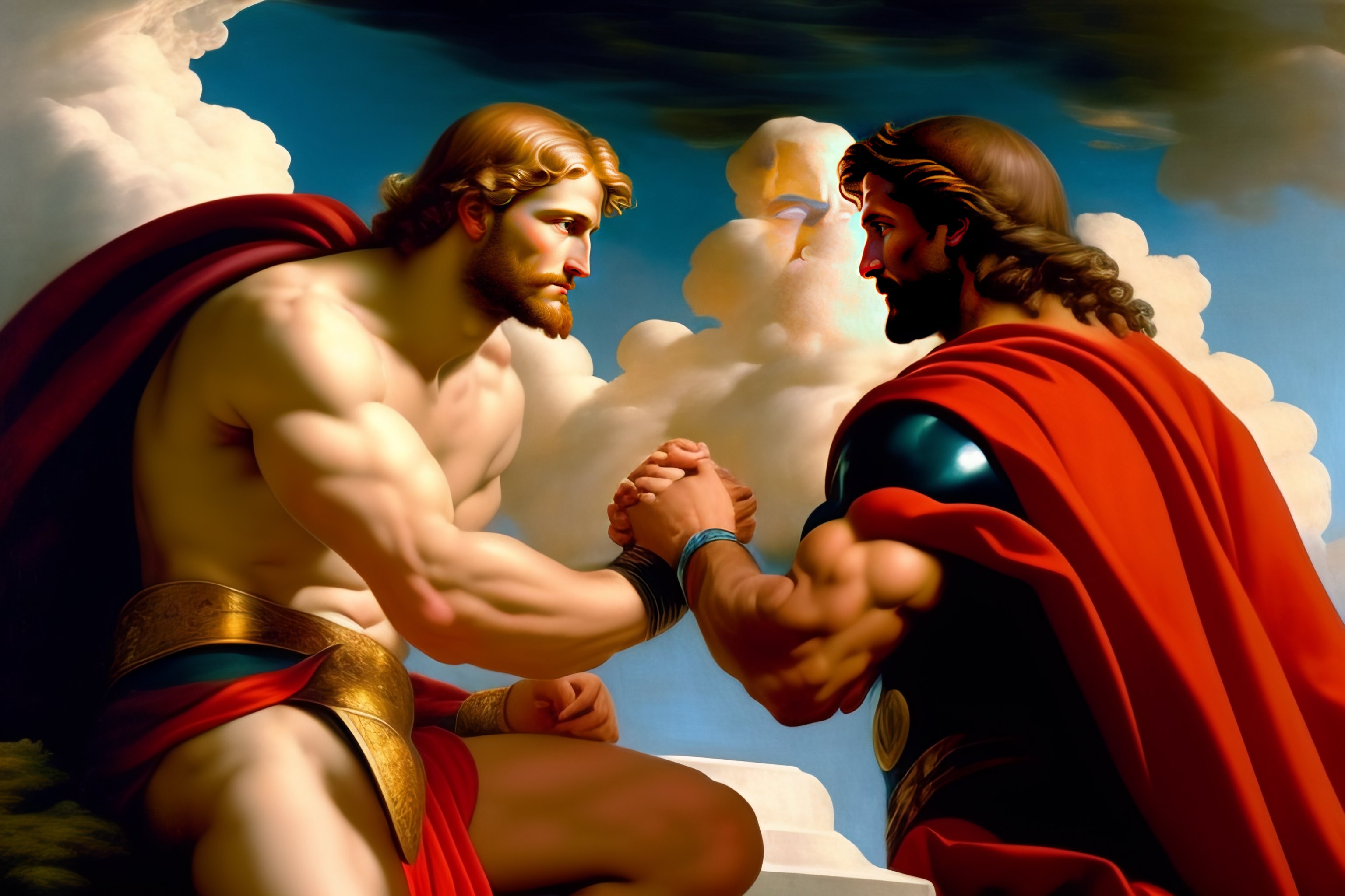 Lexica Thor And Batman Touching Fingers Fresco Painting Michelangelo The Creation Of Adam Clouds In The Background Full Body Sistine Chapel